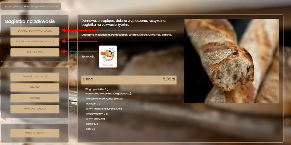 Po kliknięciu na produkt pokaże się strona produktu z możliwościami zamówienia cyklicznego, jednorazowego oraz zamówienia na jutro.