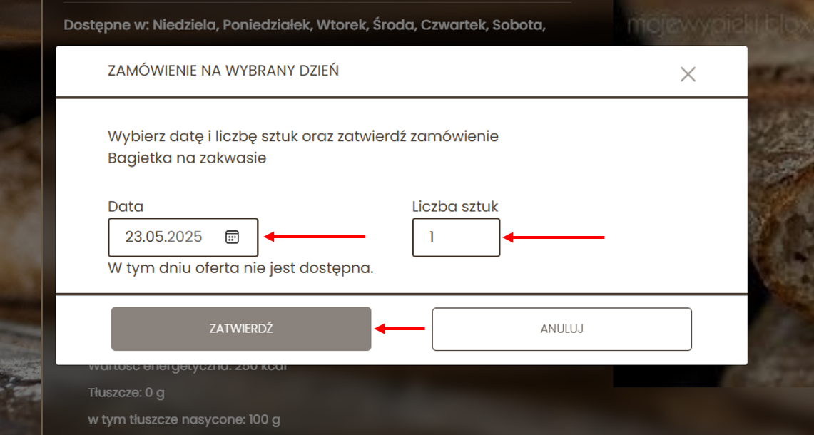Kupujący na Bake2Home ma możliwość personalizowania ilości produktu oraz dni na które chce złożyć zamówienie. Twoje zamówienie zostanie zaplanowane w kalendarzu zgodnie z wybranymi opcjami. Zamówienie zostanie złożone w przeddzień planowanej dostawy o 15.00. Do tego czasu będziesz mógł je modyfikować w kalendarzu.