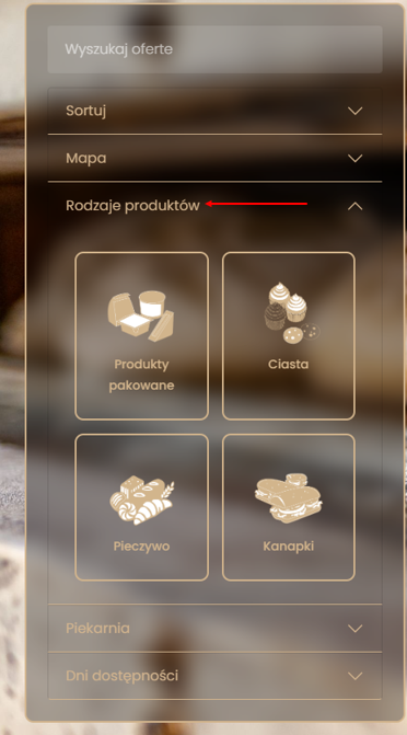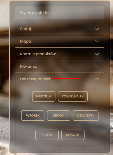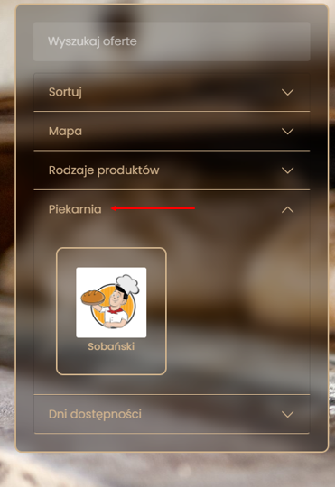 Po lewej stronie znajdują się narzędzia umożliwiające filtrowanie ofert Piekarni wg Typu produktów, Piekarni oraz dni dostępności.