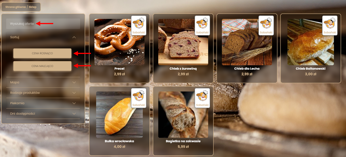 Po lewej stronie znajdują się narzędzia umożliwiające filtrowanie ofert Piekarni wg Typu produktów, Piekarni oraz dni dostępności.