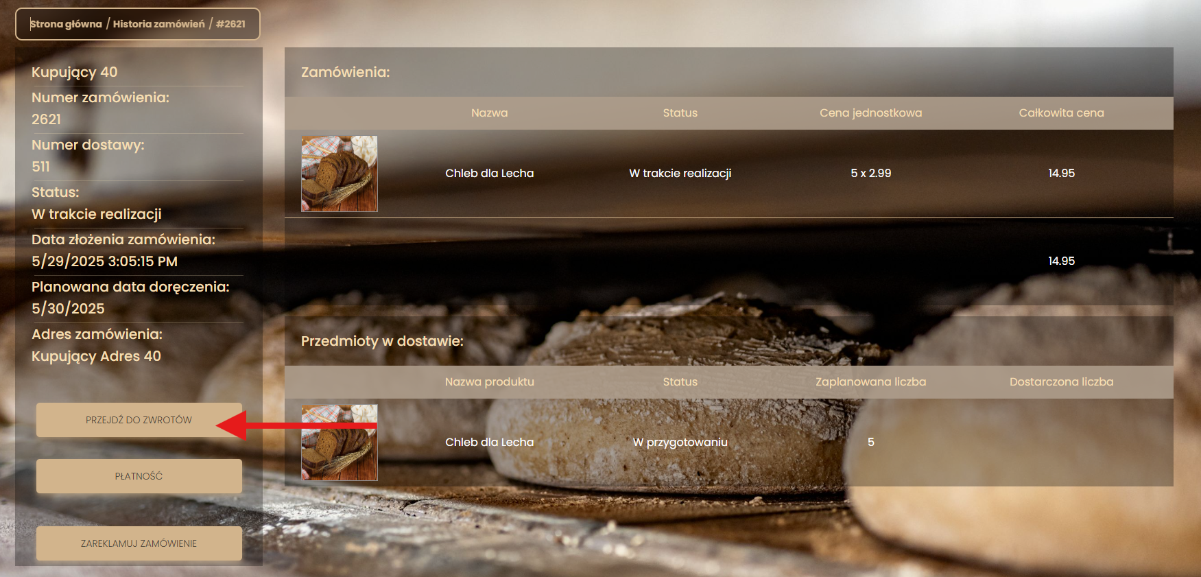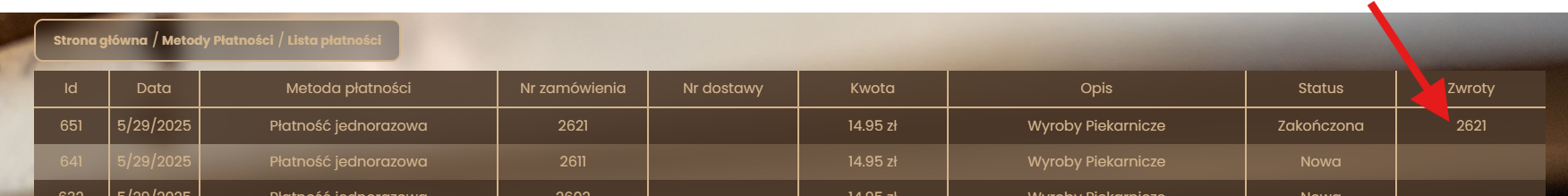 W przypadku, gdy Piekarnia z jakiegoś powodu nie będzie w stanie zrealizować Twojego zamówienia lub gdy złożysz reklamację, która zostanie uznana przez Piekarnię, otrzymasz zwrot za zareklamowane i niedostarczone produkty. Zwroty są widoczne zarówno na liście płatności, jak i na stronie konkretnego zamówienia.